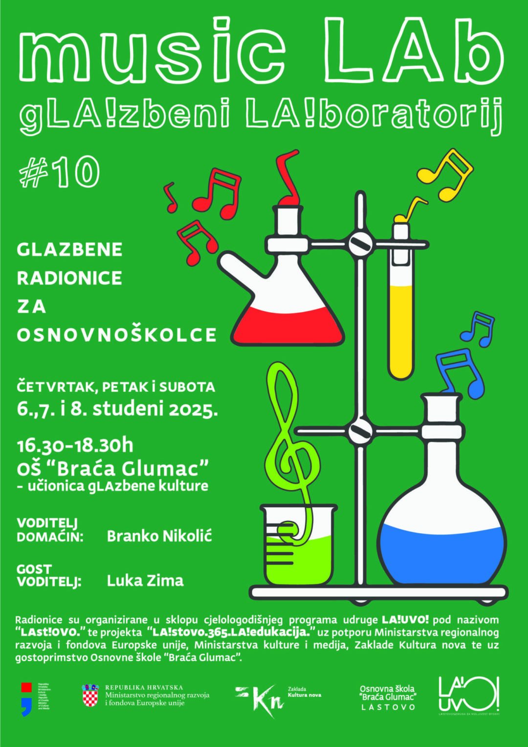 Od 06. do 08. studenoga 2025. godine održali smo desetu po redu glazbenu radionicu za djecu i mlade pod nazivom “music LAb – gLA!zbeni LA!boratorij”. Pod vodstvom Branka Nikolića i gosta voditelja LUKE ZIME, mali gLAzbenici su kroz tri dana stvarali vlastitu autorsku pjesmu – od ideje do gotove snimke!