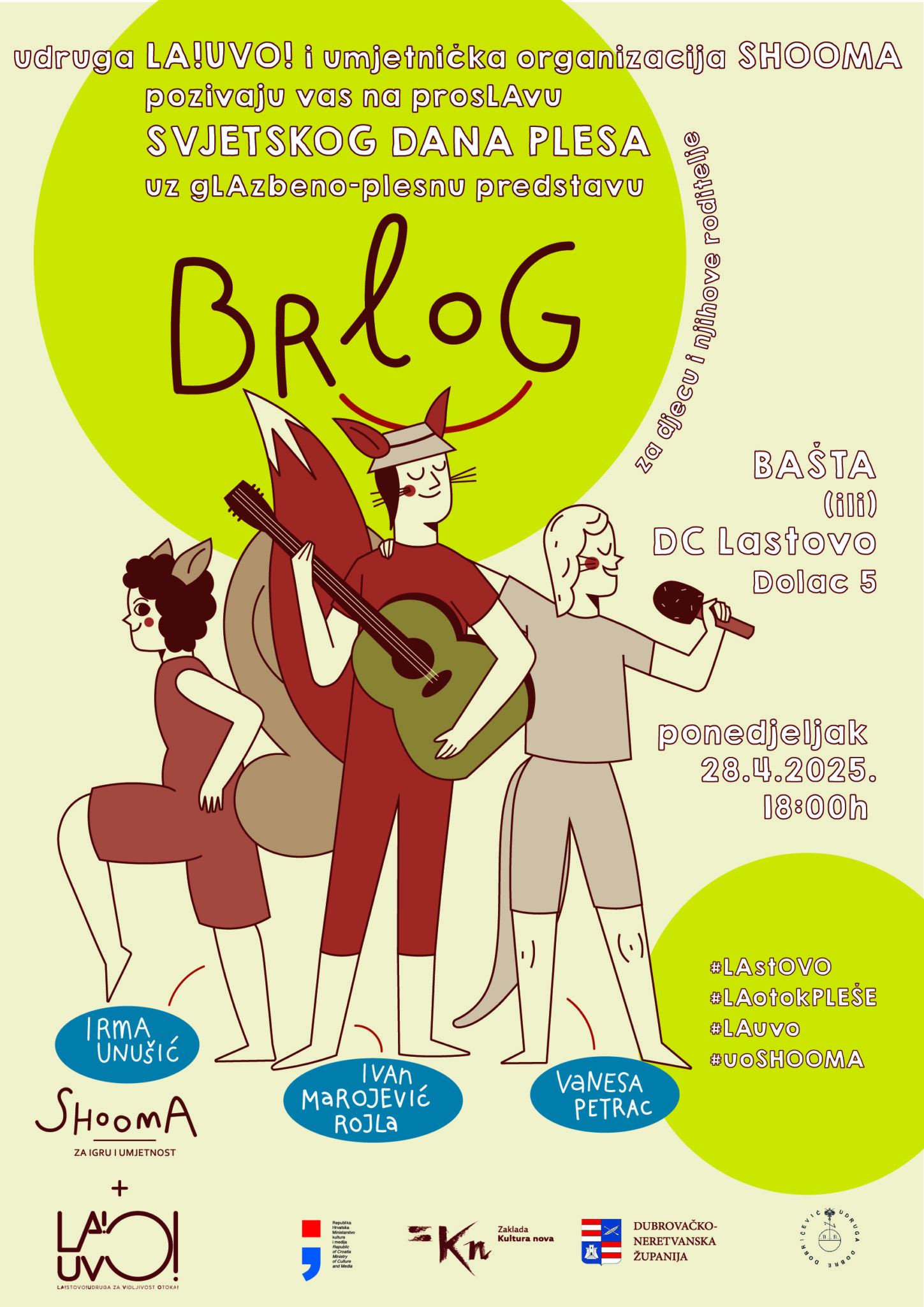 U ponedjeljak, 28. travnja 2025. godine, u Bašti Dolac u 18.00 sati, održala se glazbeno-plesna predstava “BRLOG” za djecu i njihove roditelje, u suradnji s umjetničkom organizacijom SHOOMA, a u sklopu cjelogodišnjeg programa udruge LA!UVO! pod nazivom LAst!OVO. te potprograma LA!otokPLEŠE. i otokgLAzbe.OFFsezone.