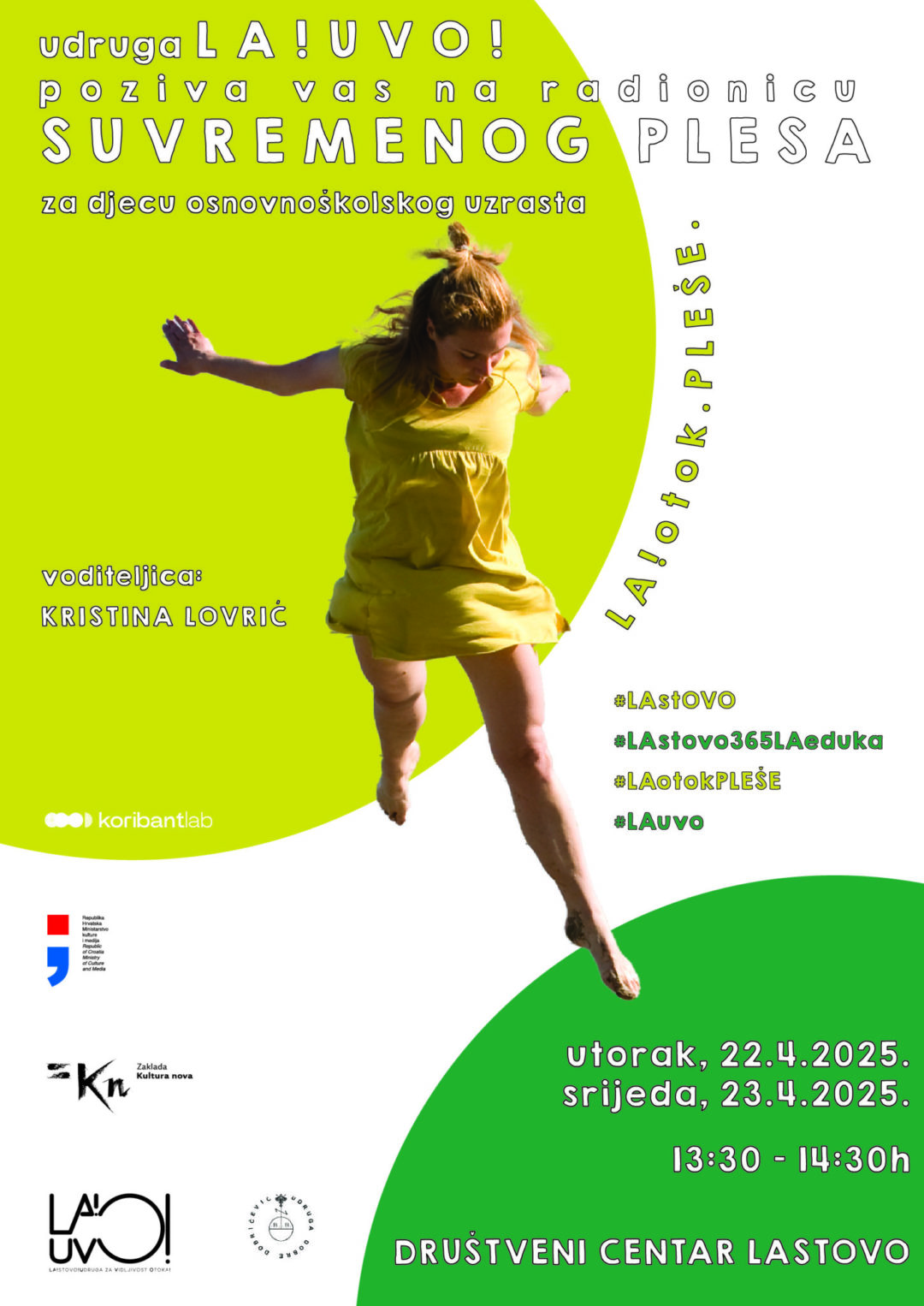 U suradnji s KORIBANT LABom, udrugom za suvremeni ples i vizualne umjetnosti iz Splita, pokrenuli smo kontinuiranu radionicu suvremenog plesa za osnovnoškolce, a prvi blok radionica održao se u utorak i srijedu, 22. i 23. travnja 2025. godine, od 13.30 do 14.30 sati u Društvenom centru Lastovo. Plesna zvijezda vodilja, Kristina KIKE Lovrić, pobrinula se da se bavimo tijelima, plesom, pokretom, prostorom.