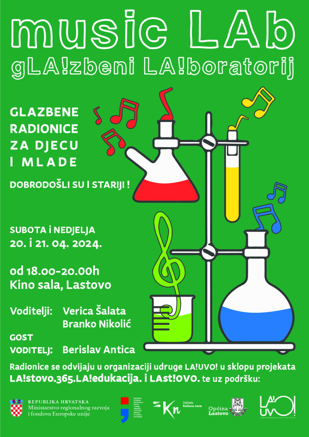 “music LAb iliti gLA!zbeni LA!boratorij” radionica je čije smo prvo izdanje organizirali u ljetu 2022. godine. Rezultat tada prve radionice bila je kompozicija koju su polaznici sami odsvirali na različite načine i sa različitim instrumentima te montirali i koju smo uklopili u video uradak sa materijalom snimljenim za vrijeme radionice. Zadovoljni takvim ishodom i interesom djece zaključili smo da music LAb mora ići dalje, usprkos&unatoč svim potencijalnim preprekama. U 2023. godini smo tako organizirali još dva izdanja, a u 2024. planiramo čak četiri bloka ovih radionica. Tako je ova radionica bila prva od četiri koje će se organizirati ove godine sa četiri različita gosta voditelja koji će uz voditelje domaćine, Vericu i Branka, djecu i mlade (ali i sve voljne odrasle!) učiti gLAzbi.