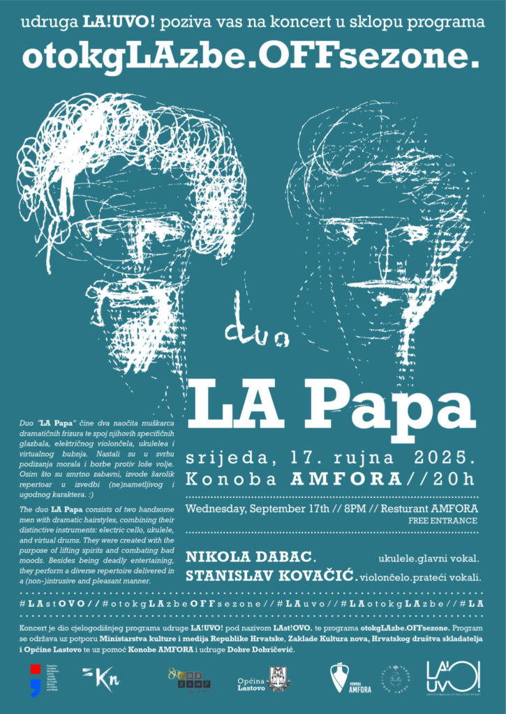 U SRIJEDU, 17. rujna 2025. godine, u 20.00 sati, na terasi svima poznatog ugostiteljskog objekta “AMFORA” na Pjevoru, održao se koncert glazbenog dua “LA Papa” u sklopu cjelogodišnjeg programa udruge LA!UVO! pod nazivom „LAst!OVO.“ te projekta „otokgLAzbe.OFFsezone.“, koji je sastavni dio gLAzbenog programa udruge „LA!otokgLAzbe.“