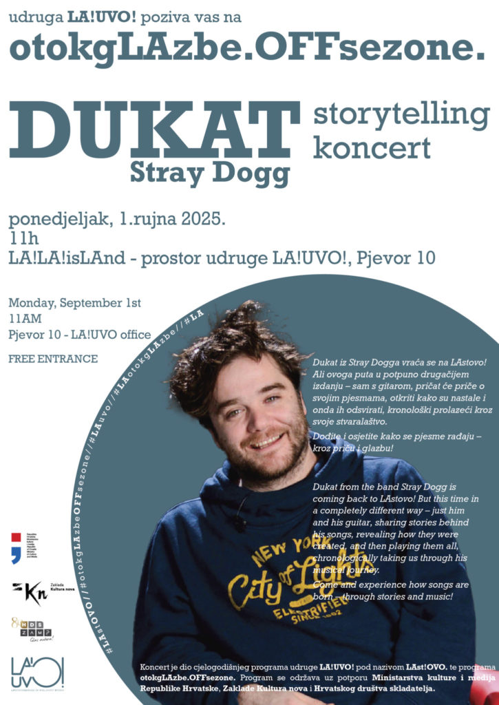 U ponedjeljak, 01. rujna 2025. godine, u 11.00 sati u prostoru udruge LA!UVO! na adresi Pjevor 10, Lastovo, održao se Storytelling koncert Dukat (Dušan Strajnić) iz Stray Dogga.
